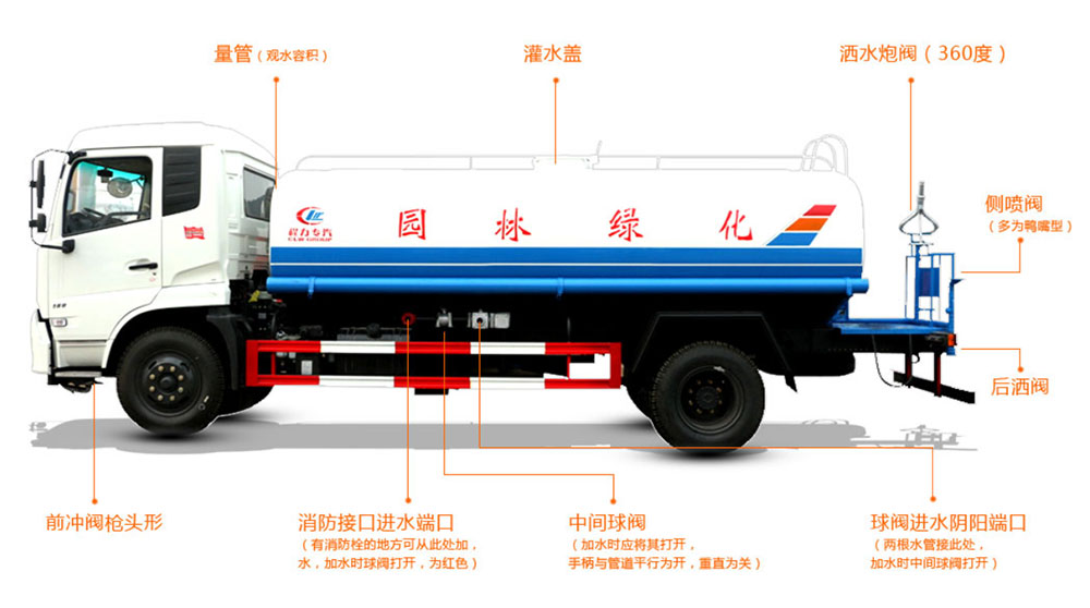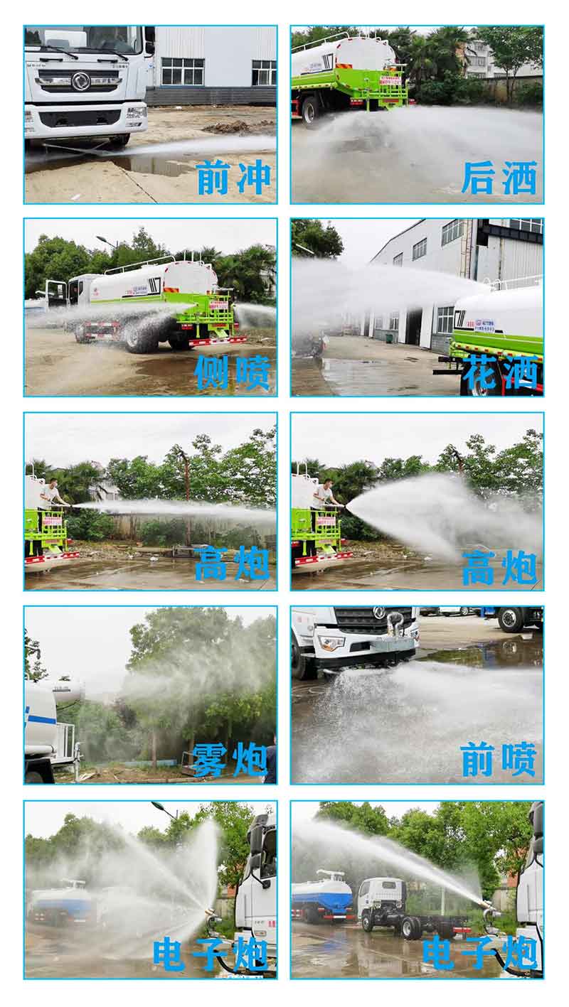 前沖(噴)后灑、帶側噴、罐體右側上端兩個高位花灑、帶后工作平臺、帶高炮、隨車安裝杭州威龍大功率60/90專用灑水泵、泵可自吸自排,壓力大射程遠、帶65MM消防接口、前沖及后灑共安裝四個可在駕駛室內控制的氣動閥、整車所有管道鍍彩鋅、整車所有50mm球閥均采用316不銹鋼材質、車輛尾部裝有LED箭頭燈灌頂帶有爆閃燈。